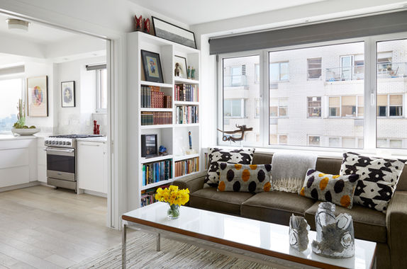 As a painter, sculptor and collector, abundant natural light and sweeping East River views drew the owner to this space. We used a bright, neutral, and subtle palette as a backdrop to showcase her art and artifacts. Architectural lighting and considered built-ins throughout utilize clean lines and maximize storage and display space. The second bedroom was converted to a den and home office and connected to the main living space by an oversized pocket door. The kitchen was modernized and opened up to the dining area, further improving circulation through the living spaces and maximizing city views.
